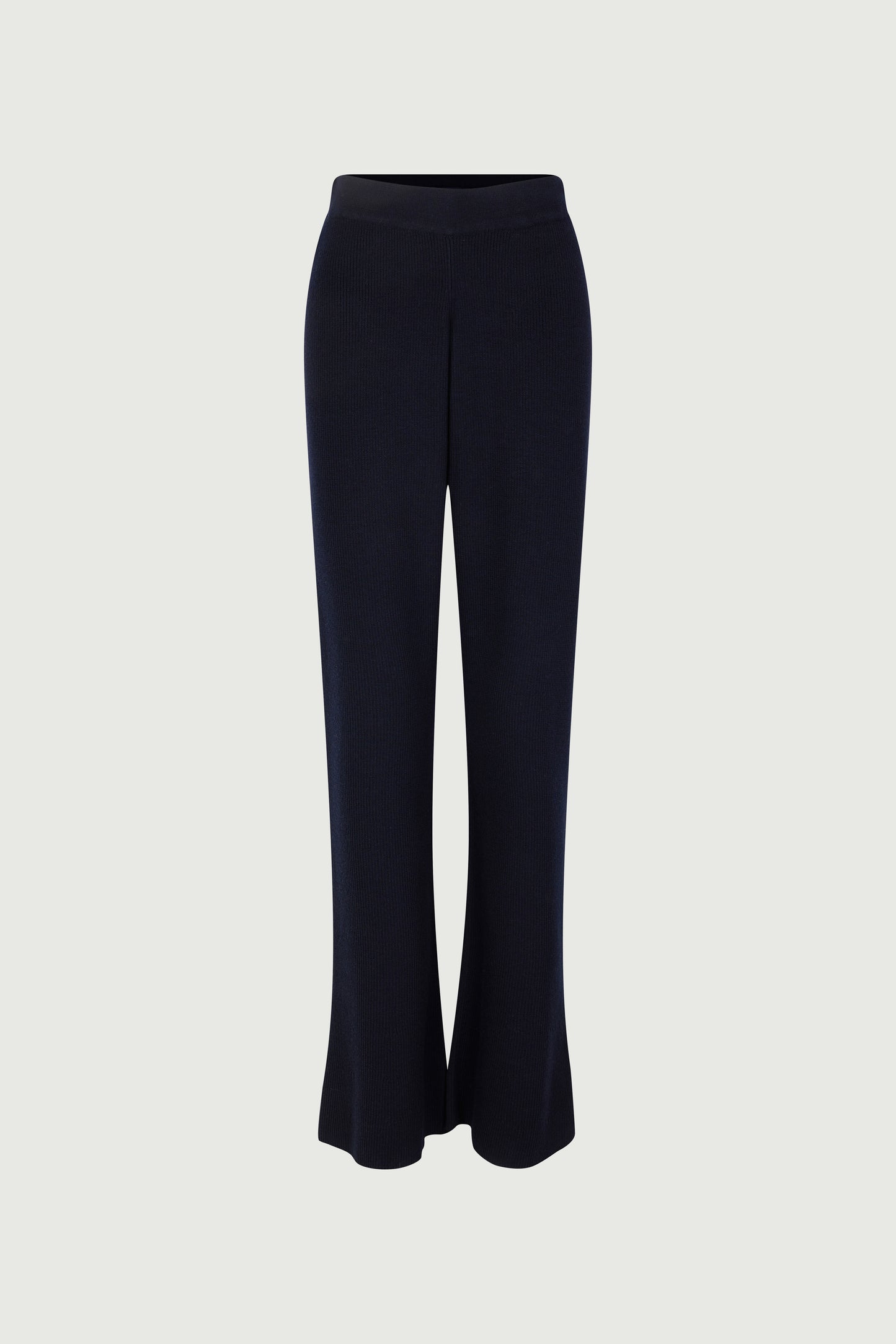 Navy blue rib knit trousers.