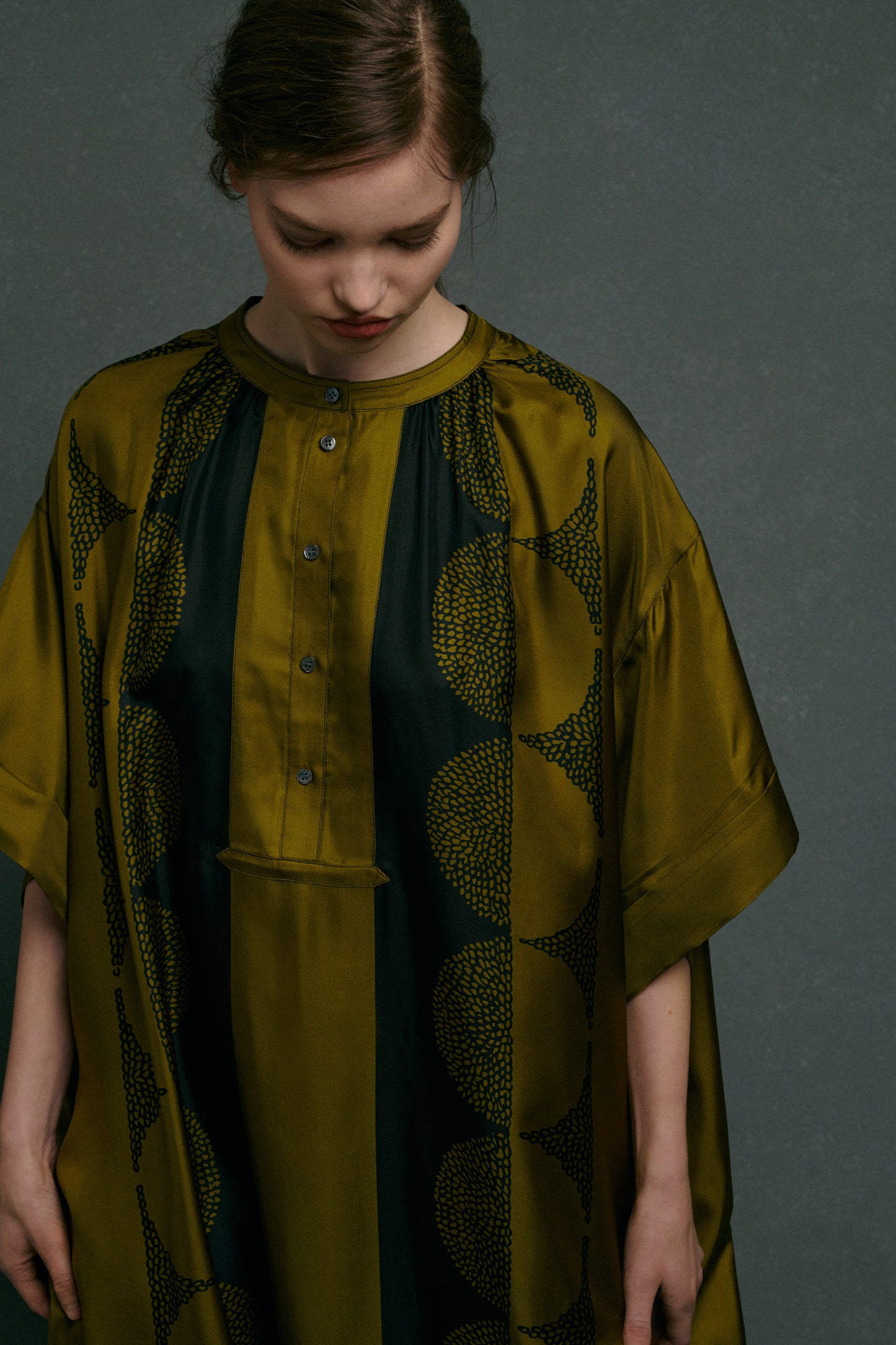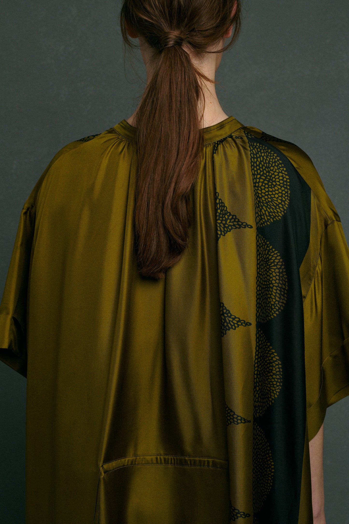 ATHENA is a long silk twill dress. The gathered pleats at the neck and its front panel give it depth and character. A belt attached at the back allows you to define the waist. The "Stencil" print shines brilliantly on this sophisticated and elegant dress.